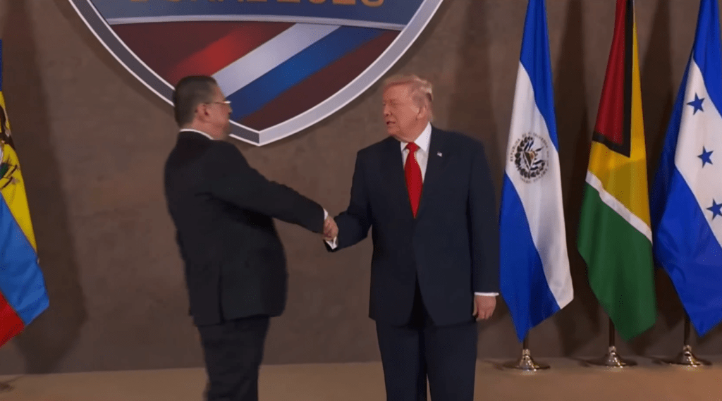 En el marco de la cumbre “Escudo de las Américas”, celebrada en Miami, Estados Unidos, el presidente de Costa Rica, Rodrigo Chaves Robles, participó en las reuniones junto a otros líderes del continente para discutir estrategias regionales contra el narcotráfico, la migración irregular y el crimen organizado.